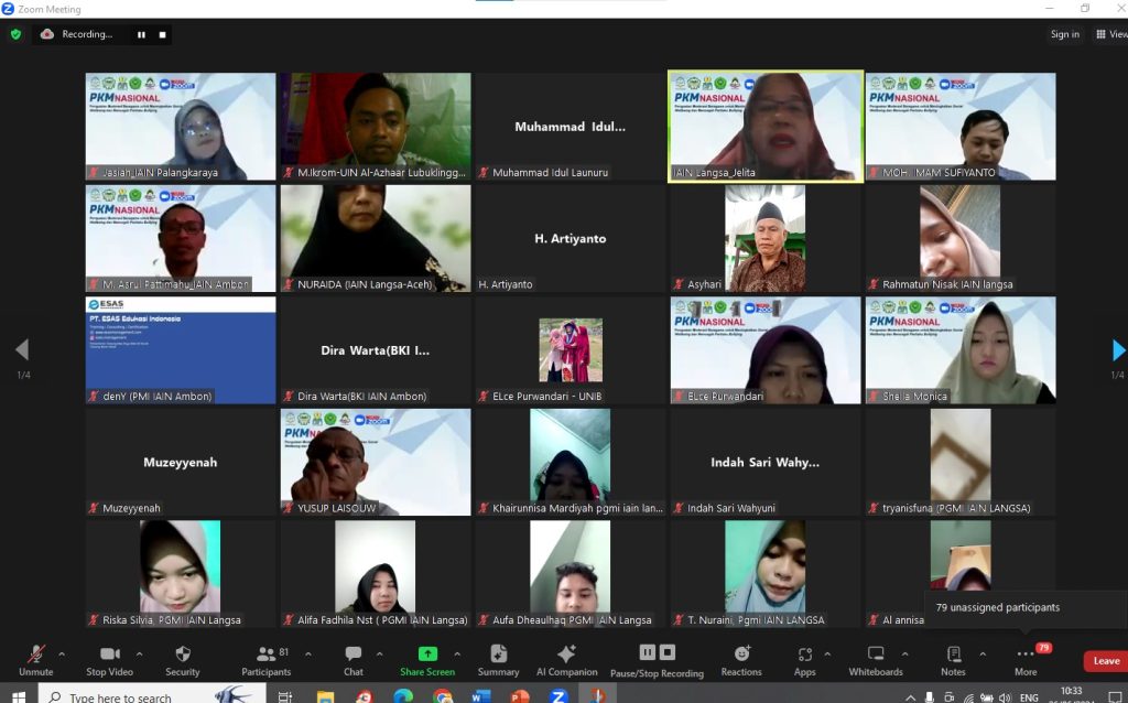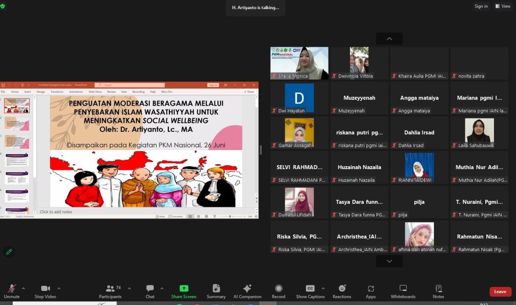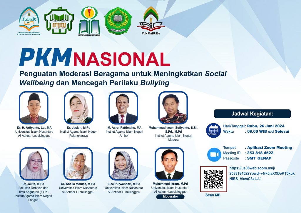 Pada tanggal 26 Juni 2024, sebuah kegiatan pengabdian kepada masyarakat bertema “Penguatan Moderasi Beragama untuk Meningkatkan Social Wellbeing dan Mencegah Perilaku Bullying” sukses diselenggarakan melalui platform Zoom Meeting. Acara ini diikuti oleh 92 peserta yang terdiri dari berbagai kalangan, termasuk guru, siswa, orang tua, dan praktisi pendidikan.